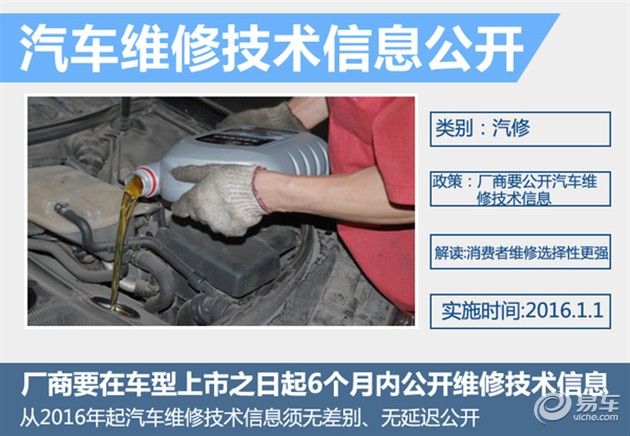由交通运输部等八部委联合发布的《汽车维修技术信息公开实施管理办法》正式实施,该办法要求从2016年起汽车维修技术信息须无差别、无延迟公开。汽车生产者自2016年1月1日起,对于取得CCC认证的乘用车和客车,要在车型上市之日起6个月内公开维修技术信息。这在很大程度上为汽车后市场的发展注入新的活力,对于消费者而言,车辆的保养、维修将更加便捷,并且选择性更大,对于维护消费者的权益提供很大帮助。