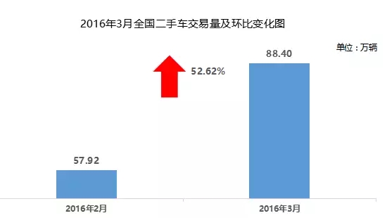 5月4日,汽车流通行业月度形势分析会在中国科技会堂举行,来自协会的汽车流通行业专家向媒体通报了2016年3月全国二手车、乘用车库存预警指数以及进口车等相关数据。数据显示,2016年3月,全国二手车市场交易量88.40万辆,交易量环比上升52.62%,交易额497.40亿元,环比上升47.00%。