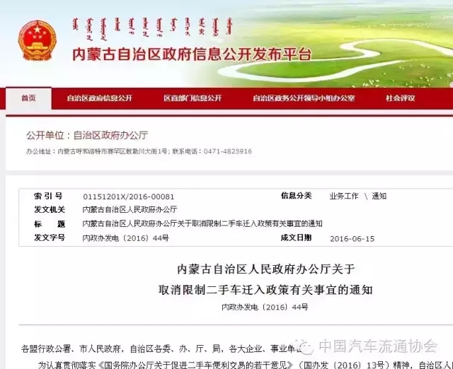 近日,内蒙古自治区政府办公厅下发通知,要求从6月15日起全面取消限制二手车迁入政策。