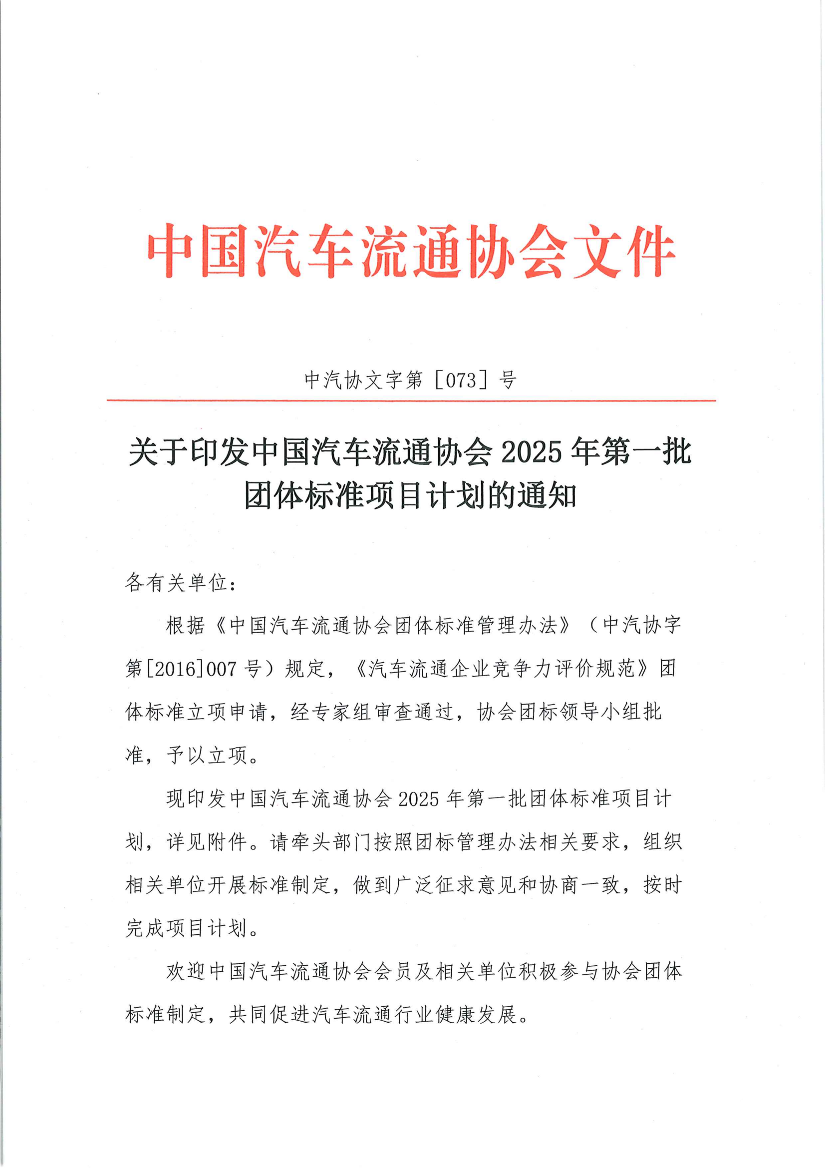 关于印发中国汽车流通协会2025年第一批团体标准项目计划的通知
