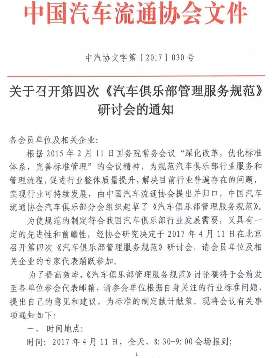 关于召开第四次《汽车俱乐部管理服务规范》研讨会的通知