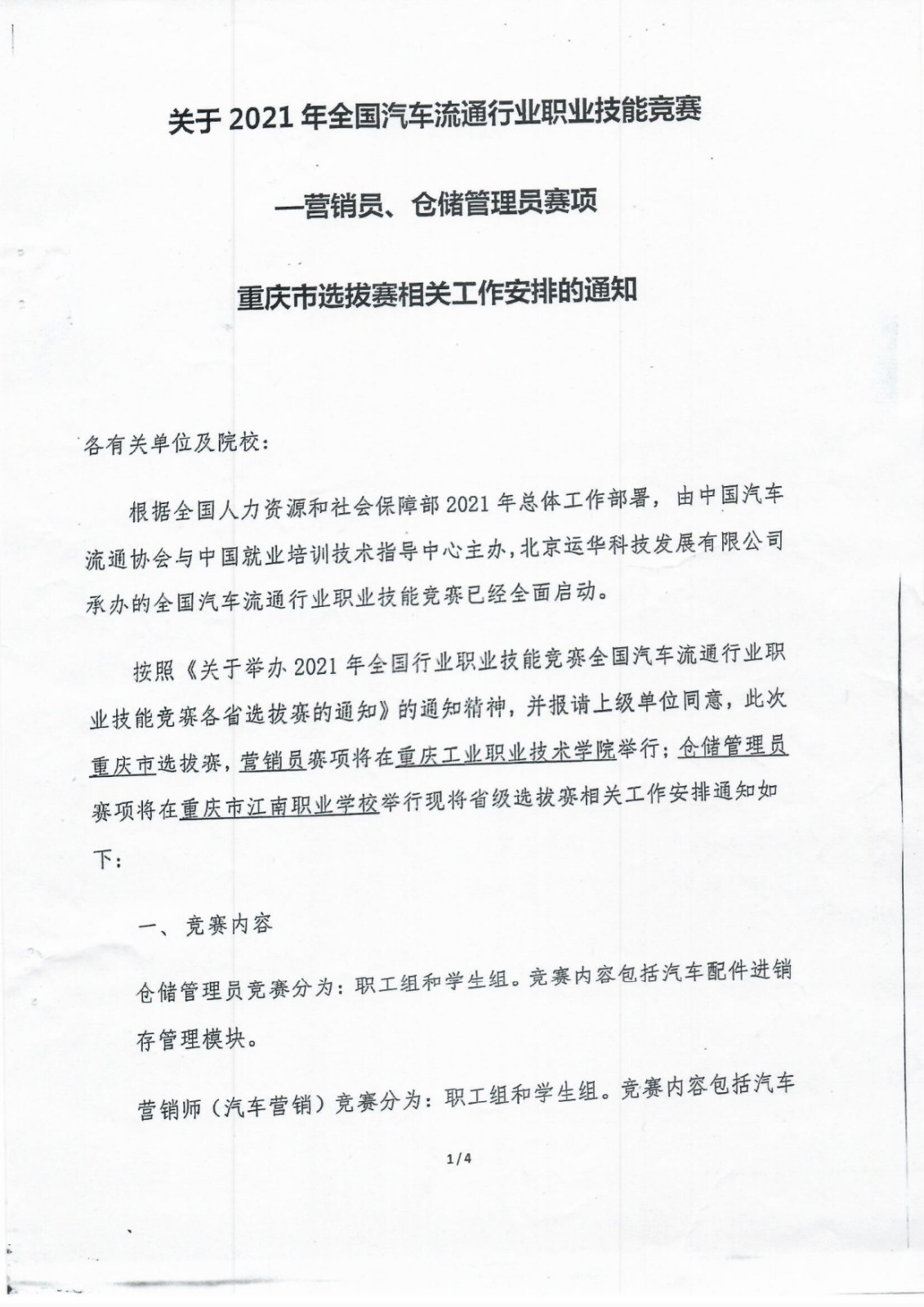 关于2021年全国汽车流通行业职业技能竞赛--营销员、仓储管理员赛项 重庆市选拔赛相关工作的通知