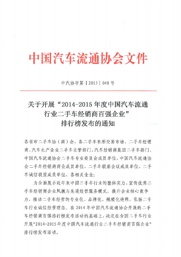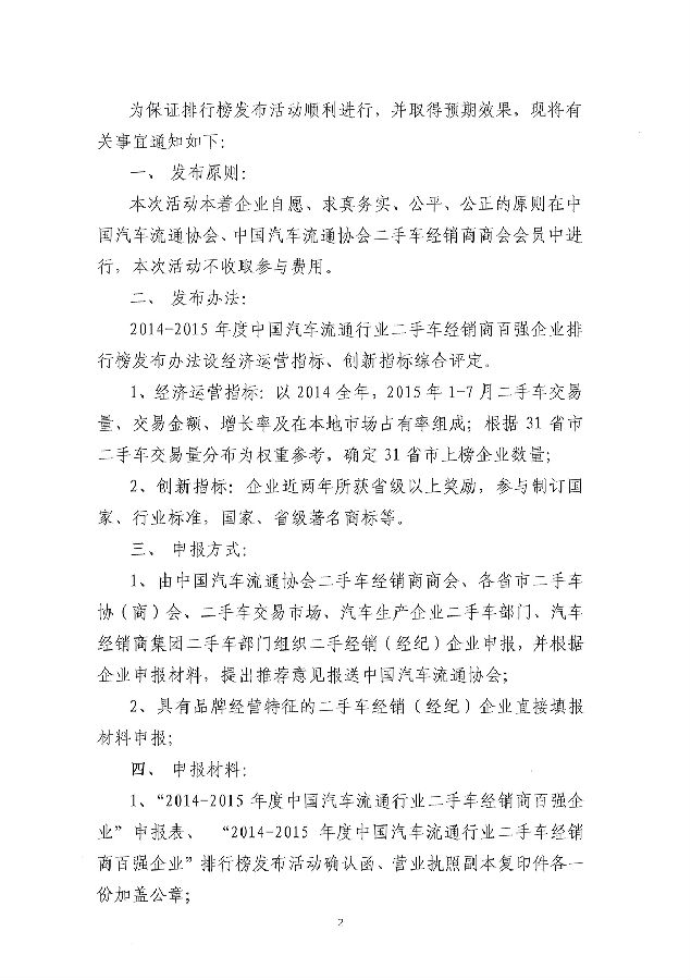 关于开展“2014-2015年度中国汽车流通行业二手车经销商百强企业”排行榜发布活动的通知.rar