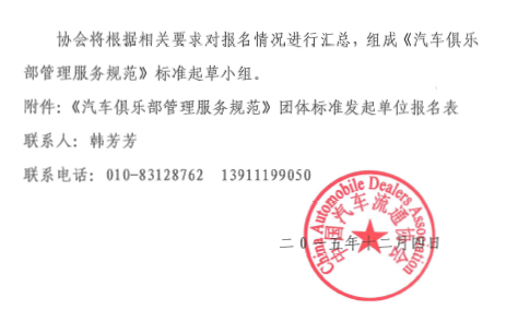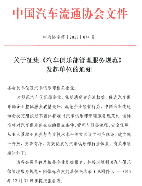 关于征集《汽车俱乐部管理服务规范》发起单位的通知