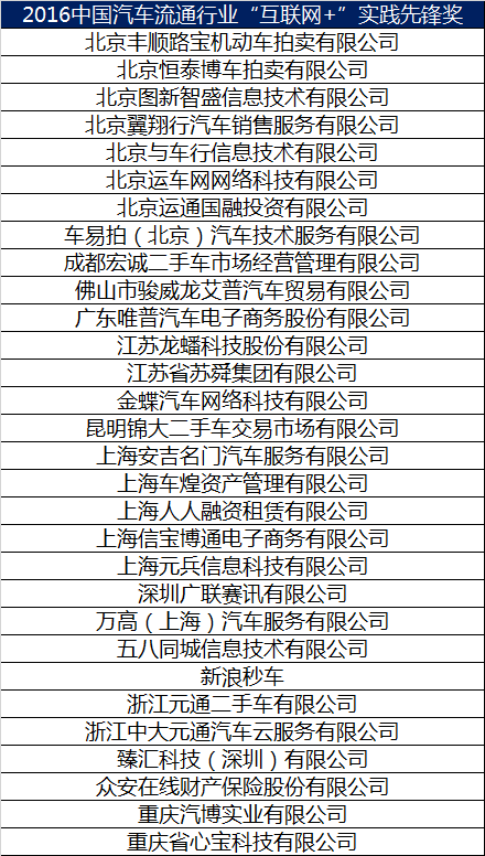2016中国汽车流通行业“互联网+”实践先锋奖获奖名单
