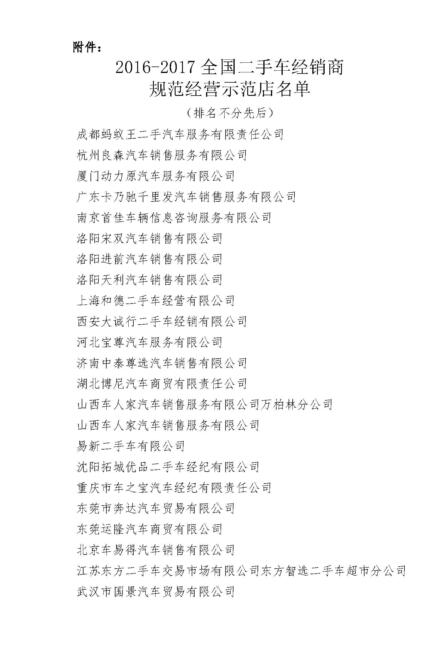 关于表彰2016-2017年度全国二手车经销商规范经营示范店的通报