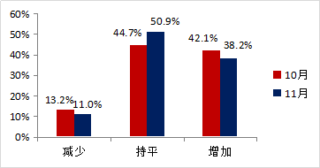 预计11月份市场需求与上月基本持平,认为市场需求“增加”的经销商比例由42.1%降至38.2%;认为市场需求“下降”的比例由13.2%降至11.0%;认为市场需求“基本持平”的经销商比例由44.7%升至50.9%。