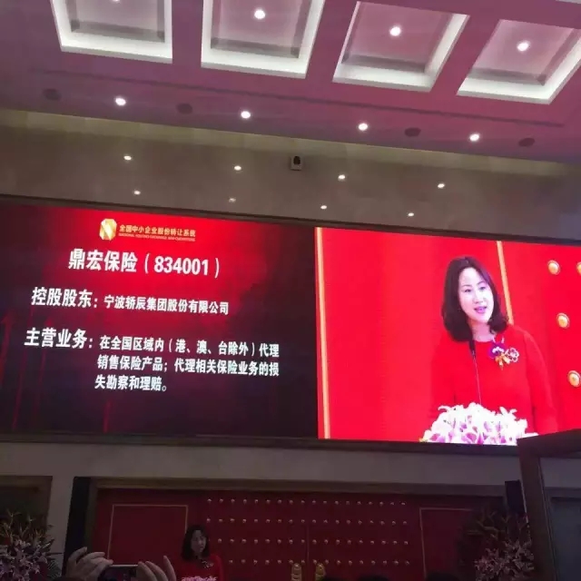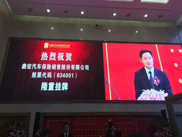 2015年12月10日,鼎宏汽车保险销售股份有限公司(834001)新三板专场挂牌仪式在京举行。中共宁波市镇海区委副书记、镇海区人民政府区长魏祖民先生、镇海区委常委、常务副区长李斌先生、宁波市金融办副主任周凯先生、镇海区委常委、副区长王巍先生、宁波市大学科技园党工委书记、管委会常务副主任叶秀贝先生、中国汽车流通协会会长沈进军先生、鼎宏汽车保险销售股份有限公司董事长汪剑君女士、鼎宏汽车保险销售股份有限公司总裁许继革先生等领导出席庆贺,并受邀共同敲响金钟。本次挂牌标志着“鼎宏保险”(834001)正式成为浙江省第一家在新三板挂牌的保险中介机构。