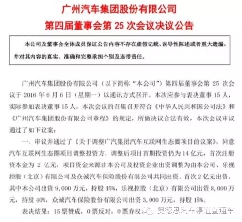 【导读】6月6日晚间,广汽集团正式发布公告称,公司董事会审议并通过了《关于调整广汽集团汽车互联网生态圈项目的议案》。公告正式公布了广汽集团汽车互联网生态圈项目将由广州汽车集团股份有限公司、乐视控股(北京)有限公司及众诚汽车保险股份有限公司共同出资,三方股比分别为45%、40%和15%。