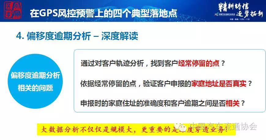 沈剑谈及GPS风控预警本质是通过安装车载智能硬件设备(例如GPS)到车贷客户的车辆上,借助车联网云平台的分析、监控和预警能力,帮助汽车金融公司实现贷前、贷后的风控及资产回收。具体来说,在汽车金融风控体系里的贷前环节,可以让GPS的服务商、安装商去现场进行一个渠道的真实性的验证,而这方面还可以去看到车型VIN码是否匹配,以避免低配高贷这样的问题。另一方面在贷后环节通过设备的断电拆除报警、子母分离报警以及各种大数据的一些分析算法,可以实现更精细地数据这方面的运营。GPS风控预警应该是汽车金融风控中已经完全不可分割的一个关键部分。