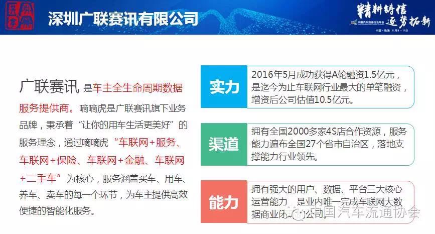 广联赛讯是以车联网的信息服务作为服务商,主要围绕车主的买车、用车、养车和买车的一个全生命周期需求,以“车联网+服务、车联网+保险、车联网+金融、车联网+二手车”为核心,开发高品质的产值与服务。广联赛讯一直以数据是的立命之本,而服务是制胜之道为广大的合作伙伴服务。