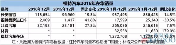 2016年,福特在华合资企业长安福特(CAF)同时创下年度销量新高和12月单月销量新高。2016年,长安福特销量高达957,495辆,较2015年的836,425辆攀升14%。其中,长安福特12月销量超出115,000辆,较2015年同期增长近两成。福特在华另一家合资公司,江铃汽车2016年销量为265,056辆,较2015年销量上涨7.5%。其中,去年12月销量达32,193辆,较2015年同期劲增28%。