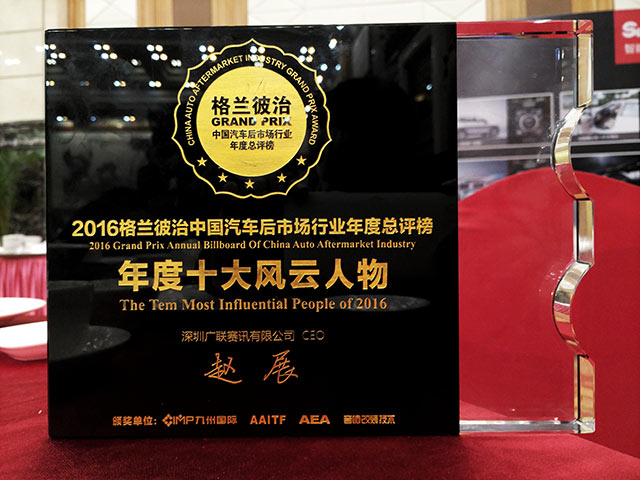 在随后举办的“2016格兰彼治中国汽车后市场年度总评榜”颁奖典礼上,广联赛讯CEO赵展荣获“2016年度十大风云人物”称号。评委会给出了这样的颁奖词:“从羊肠小径到康庄大道,嘀嘀虎治数据如烹小鲜,从信息孤岛到智能车联,广联赛讯的车联网版图在不断扩张,赵展的车联变现之道大有可为?!被毓?016年,汽车后市场相对于整车市场,也呈现稳健增长趋势,这离不开汽车后市场企业的共同努力。在风云莫变的汽车后市场,正是这些“风云人物”,始终耕耘在自己的岗位上,为汽车后市场的发展奉献着自己的力量。