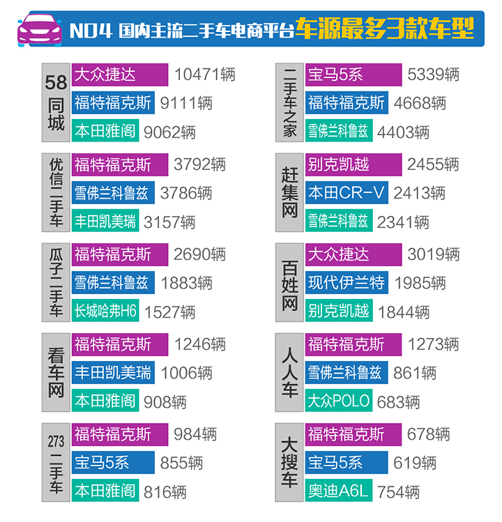 参考各个平台车源最多的三款车型,想购买这些车型的朋友可以去对应平台选购,车源多,选择空间大,可以尽情挑选优质车况车辆,杀价砍价。综合十大平台最多的3款车型,福特福克斯、雪佛兰科鲁兹、别克凯越车源够多,与这些车的市场保有量大有直接的关系。