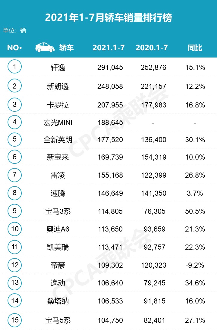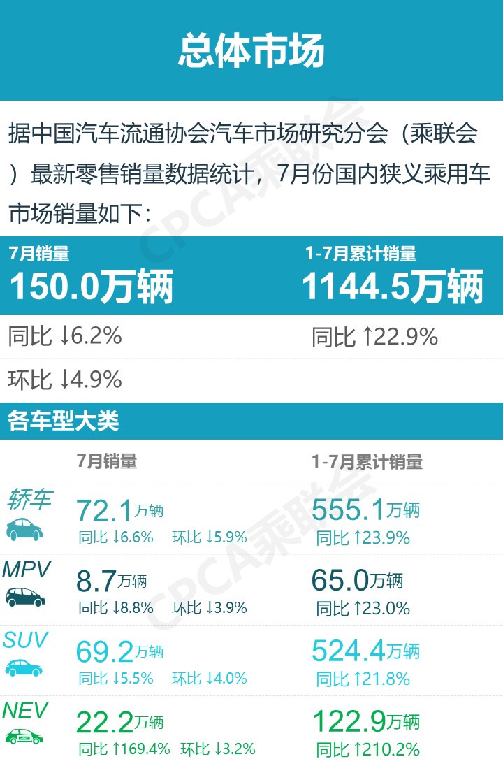 据中国汽车流通协会汽车市场研究分会(乘联会)最新零售销量数据统计,7月份国内狭义乘用车市场销量达150.0万辆,同比下降6.2%,环比下降4.9%;1-7月份累计销量1144.5万辆,同比增长22.9%。